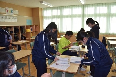1年生教室では、英語のワークをチェック?