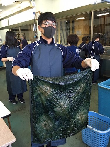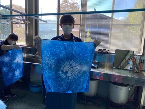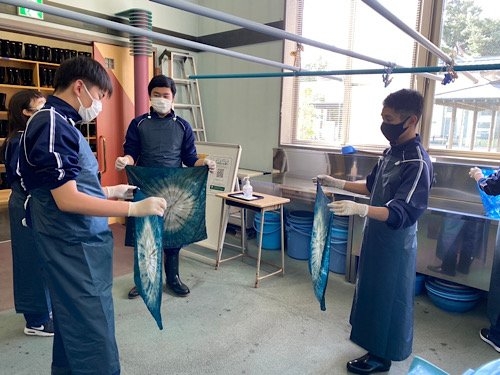 【上西春別中】修学旅行記12 9/7歴史文化体験! 2022年09月07日(水) 歴史文化ミュージアムで藍染め体験を行いました。 独特な藍のにおいを感じながら「しぼり」柄に挑戦しました! みんなはじめての体験でしたが、味のあるバンダナが完成しました。