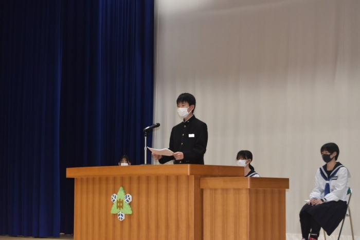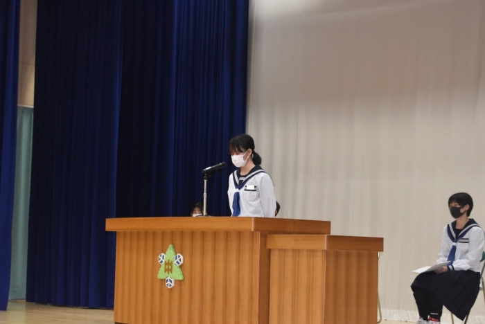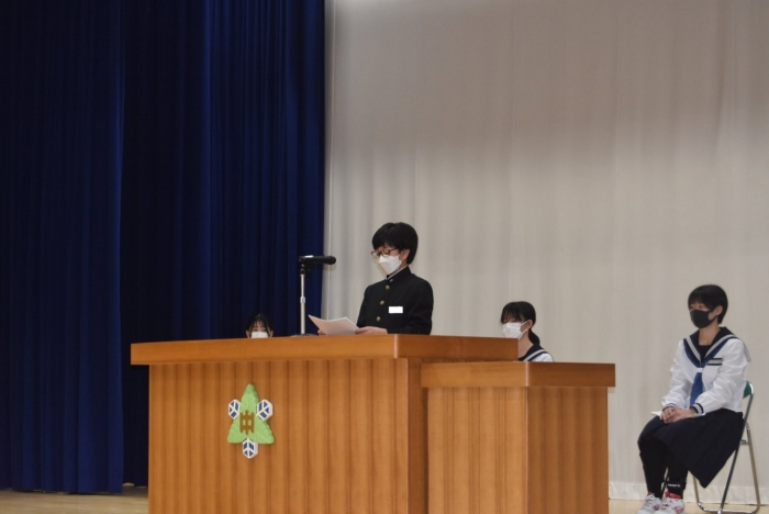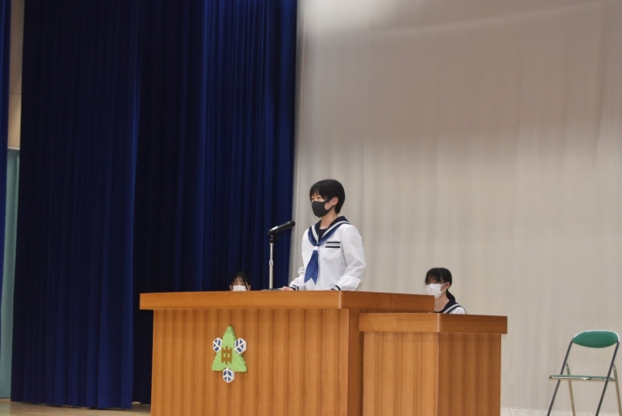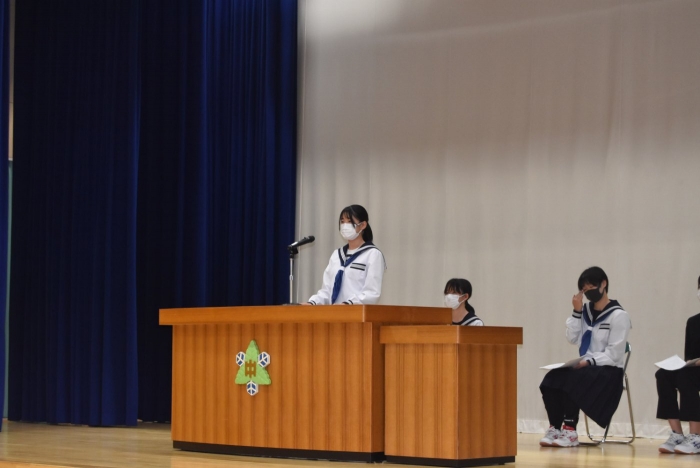 校内主張発表大会 2022年09月26日(月) 行事 国語の時間で取り組んできた主張文。 各学年で学級発表会を行って選ばれた代表者2名ずつが、本日の校内主張発表大会に臨みました。 どの主張発表も大変すばらしく、難しい審査となりました。 審議の結果、最優秀賞と優秀賞に選ばれた2年生2名が、11月に行われる別海町の弁論大会に出場します。