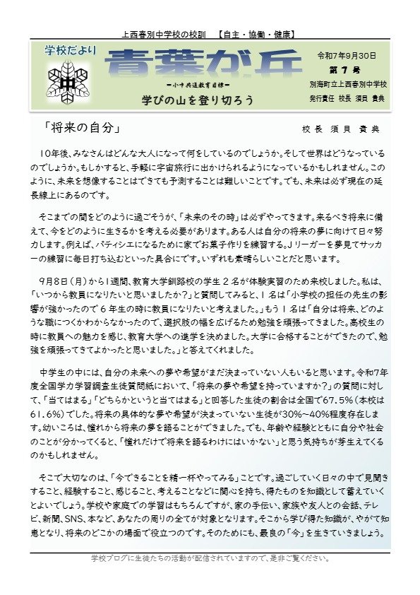 学校だより9月号(第7号)を配信します。ご高覧頂ければ幸いです。
