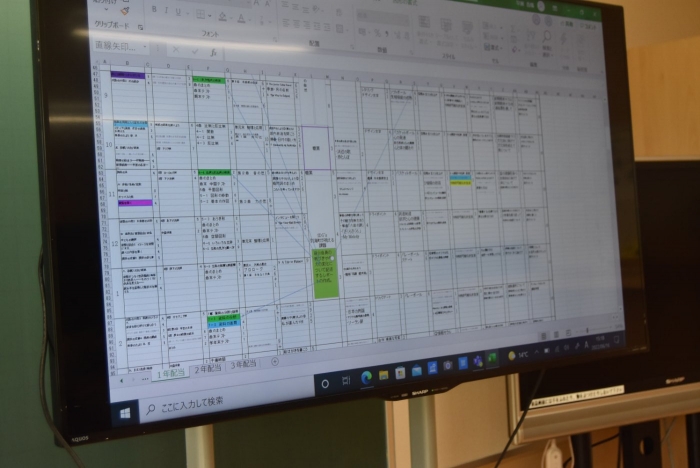 各教科等の目標を達成する手立てとしての言語活動を充実させるための授業改善について考え、その関連を単元配当表を用いて視覚化しました。