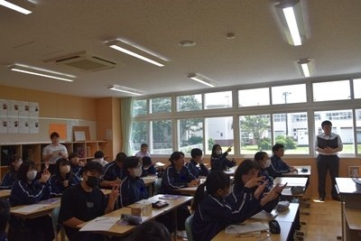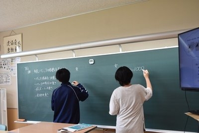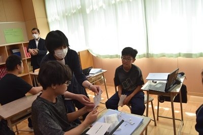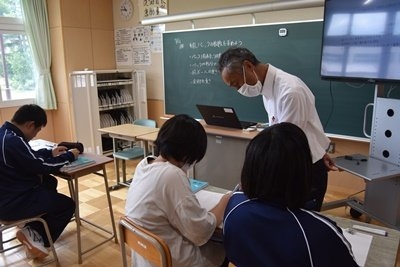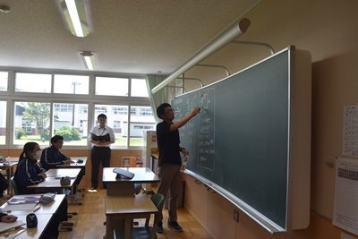 また、英語の授業には丸山小学校 奥村主幹教諭に講師としてお越しいただいただいたとともに、上西春別小学校から2名の先生が数学と英語の授業を参観し、研究協議にも参加してくださいました。