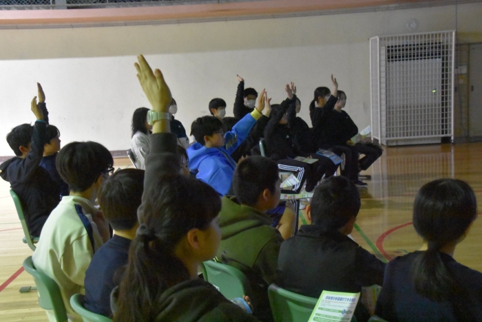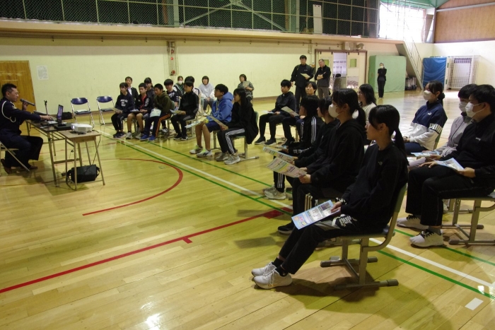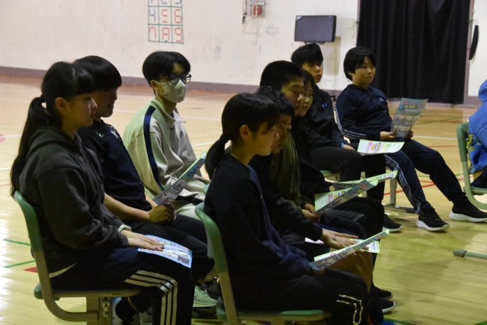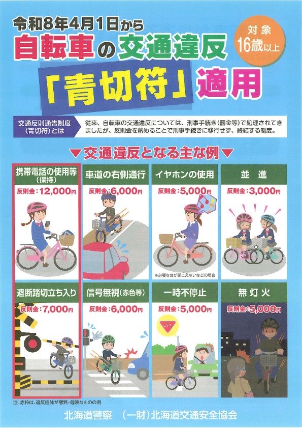 自転車交通安全教室 2026年04月24日(金) NEW 日々のできごと 本日、6時間目に中標津警察署交通課の方を講師としてお招きし、自転車交通安全教室が行われました。中学生は「青切符」が適用される16歳以上ではありませんが、ヘルメットのことや反対通行、並進、イヤホンの使用など自転車が自動車であるということを自分事ととして捉え、話を聞いていました。自転車が条件によって歩道を通行できる場合などもあるということでいただいた資料も掲載します。(許可済み リーフレットはクリックすると裏面もご覧になれます。)