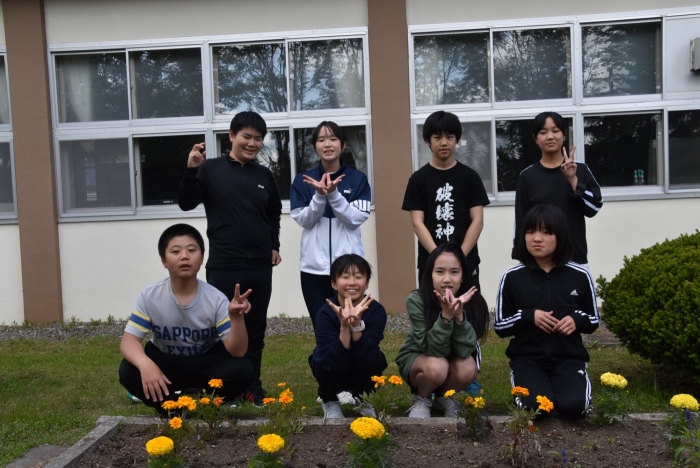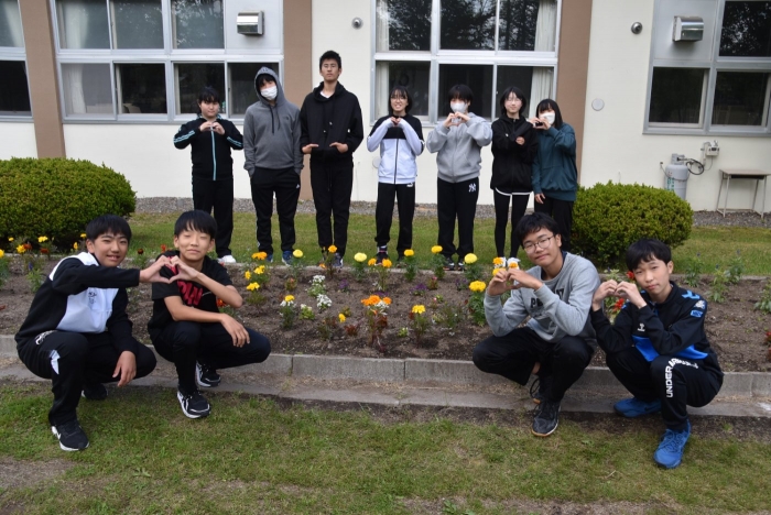 避難訓練の後、1・2年生は花壇の前で記念撮影をしましたので紹介します。