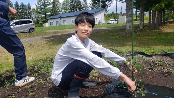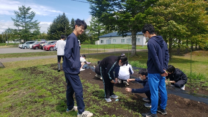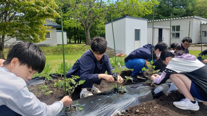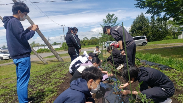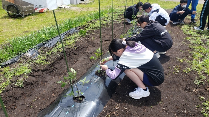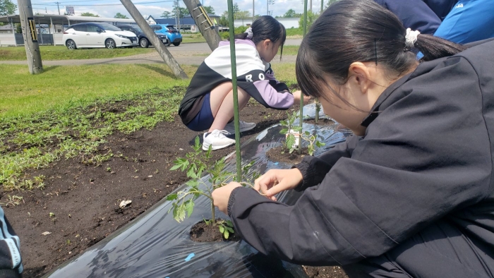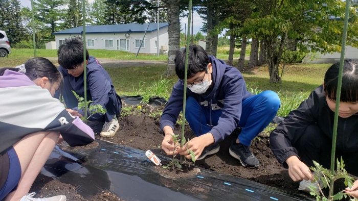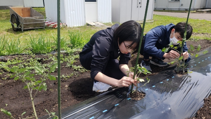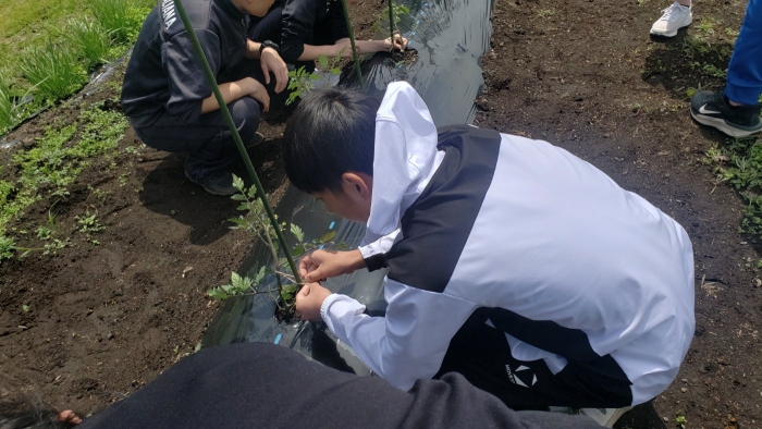 トマトの苗のそばに棒を立てる作業をおこないました。