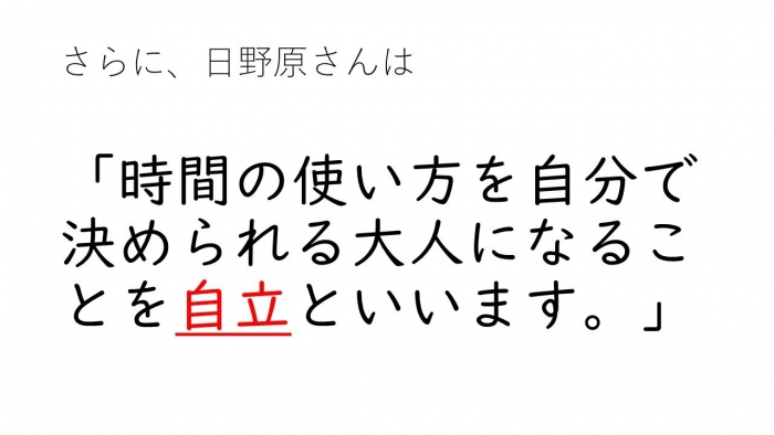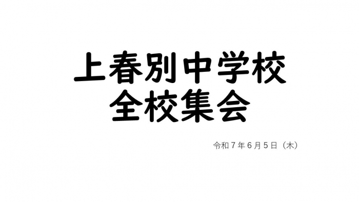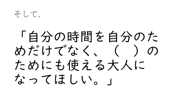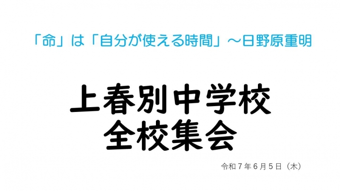 校長講話② 2025年06月05日(木) 校長講話では日野原重明さんの命の授業からお話をしました。 「自分の時間を自分のためだけでなく、( )のためにも使える大人になってほしい。」 ( )にはいる言葉を考えてくださいということで話を終えました。