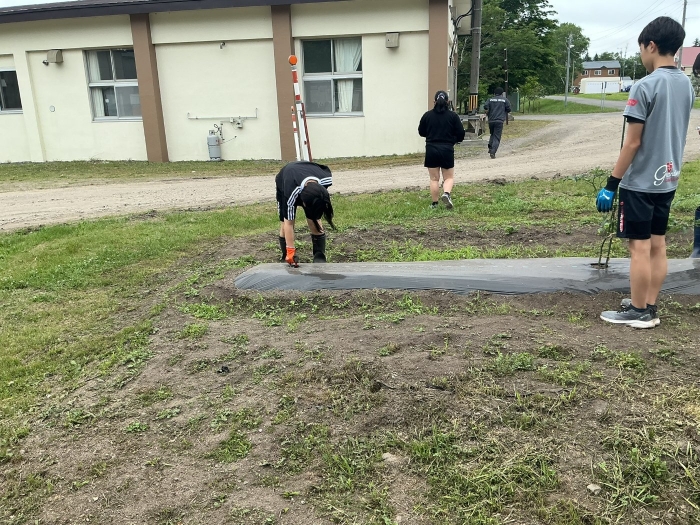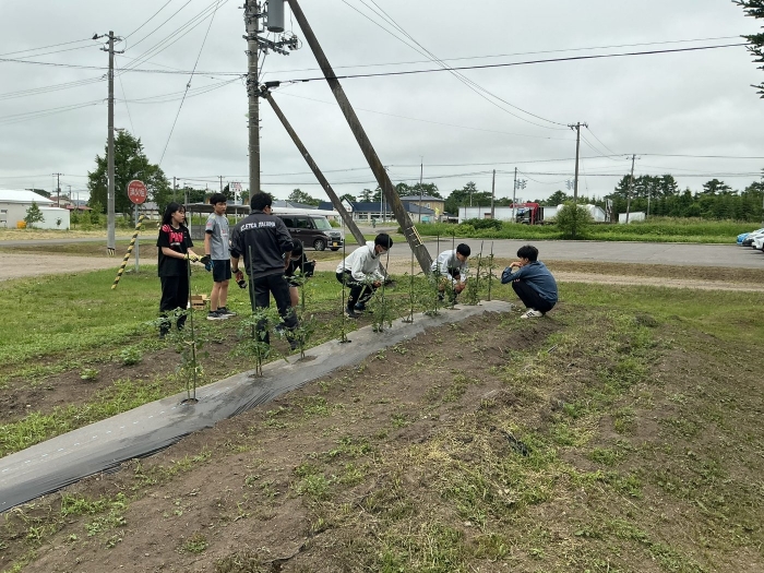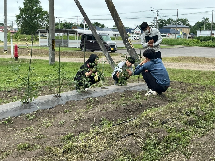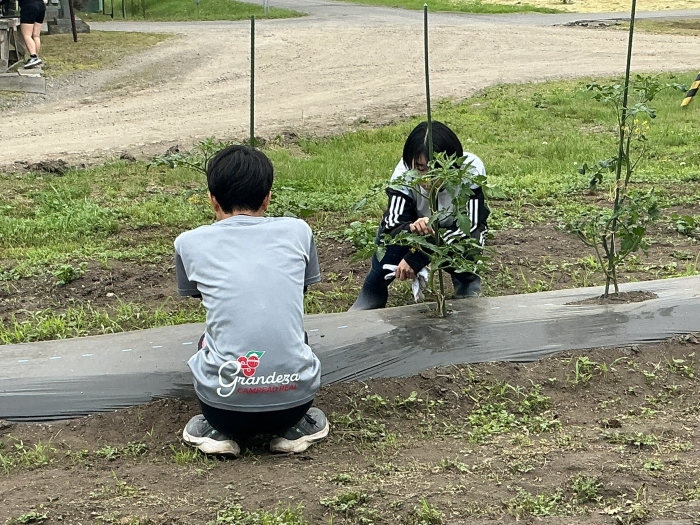 3年生の技術で栽培しているトマトの様子です。手入れをしています。