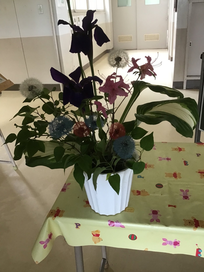 校舎周辺に咲いている花を摘んで生花を作りました。