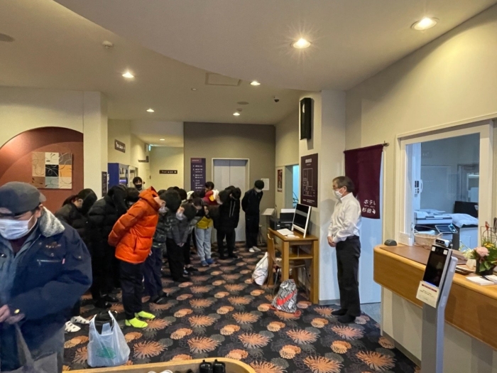 お世話になったホテルにお礼をしてこれから別海町に帰ります。【全道スケート】 2022年01月10日(月) 少年団・部活動 大会期間お世話になったホテルに感謝を込めてお礼の挨拶を全員で行いバスに乗り込みました。 毎日美味しい食事を作って頂いたり、部屋の清掃も丁寧でした。また、大浴場もあったので選手の皆さんは日々の疲れを癒すこともできました。ホテルの皆さんありがとうございました。 では、これからバスに揺られ別海町に帰ります。