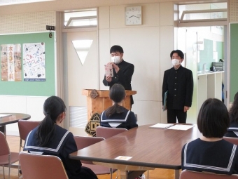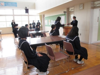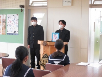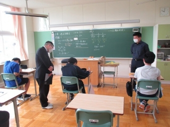 【上風連中】1日の様子 2022年06月08日(水) 日々のできごと 羽球部の表彰のあと、全校朝会をおこないました。 「疲れたら○○○」「一日ひとつ○○○○ことをする」という校長先生の話がありました。 また、文化委員会より、おすすめ本の紹介がありました。 国語の授業ではポップづくりをおこなったり、白鳥号ではどっさり本を借りたり、とても本の好きな生徒です。7月のビブリオバトルが楽しみです。 職員研修で、前期の授業交流をおこなっています。 これまで1年音楽、2年理科をおこないました。 今日は2年数学「2元1次方程式」でした。