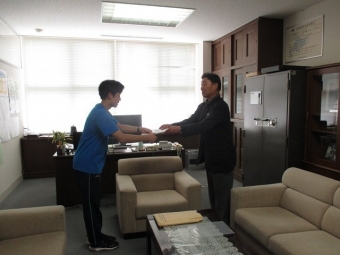 【上風連中】図書室 2023年08月21日(月) 日々のできごと 日本教育公務員弘済会より図書室の本40冊が寄贈されました。 代表して生徒会長が受け取りました。 文化委員会の活動により、本の整理や展示の工夫をするなど、図書室が日々変化しています。