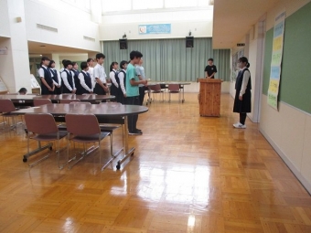 【上風連中】全道卓球大会 2023年08月31日(木) 日々のできごと 週末、釧路で開催される卓球の全道大会に出場する選手の激励会をおこないました。 いつもの「水分補給」と、応援メッセージを全校生徒で伝えました。 出場選手は、感謝の言葉と意気込みを語ってくれました。