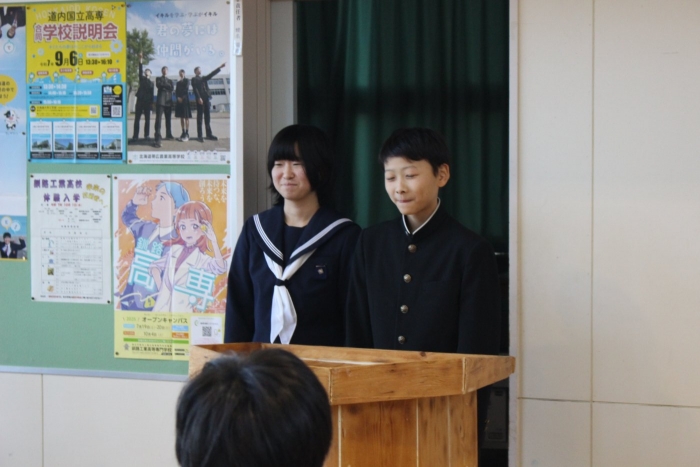 生徒会選挙立会演説会 2025年10月31日(金) NEW 10月29日、生徒会選挙立会演説会を行いました。 今回は対立候補がいないため無投票で立会演説のみとなりました。 新生徒会メンバーの今後の活躍が楽しみです。 会長候補は病休で立会演説に参加できませんでした。