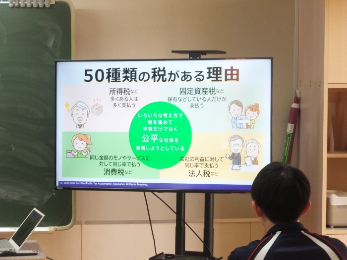 租税教室(3年生) 2024年12月16日(月) 12月16日(月)、3年生の社会の時間に租税教室を行いました。釧路中央税理士会の税理士、緑川美千代さんに講師をお願いしました。自分が社会に出た時、税金を支払うということがどんなことなのか、税の負担があっても公共のサービスが充実した方がいいのか、などいろいろ考えさせられる授業でした。お忙しい中、来校いただいた緑川さん、本日はありがとうございました。