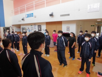 6校時は「全校体育」。現在、「バレーボール」に取組んでいます。縦割り班として、チーム毎にウォーミングアップや各種練習を行い、最後はゲームを行う予定です。もちろん、体育の授業も本時の目標(課題)と振り返りの時間を設け、次回へのつながりを大切にしています。