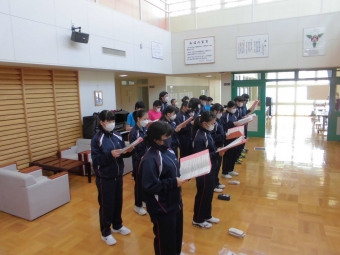 5校時は「全校音楽」。学年毎の授業は勿論ですが、総合的な学習の時間の一環として年間通じて全員で取組んでいます。最初は全員で「声のウォーミングアップ」。その後、「パート練習」を経て、最後はまた全員揃って合唱練習をします。再来週予定している「授業公開日」では、地域や保護者の皆さんに活動の様子をご覧いただくこととなっています。
