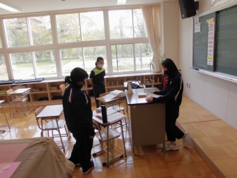 最初は全員で「声だし」。続いて「各パート練習」。男子のパートは円陣になり、大きな声で歌っています(校長室まで響いてきました)。1名早退により3人体制となっているパートはリーダーが、「大変だけど頑張ります。」と頼もしい一言が。