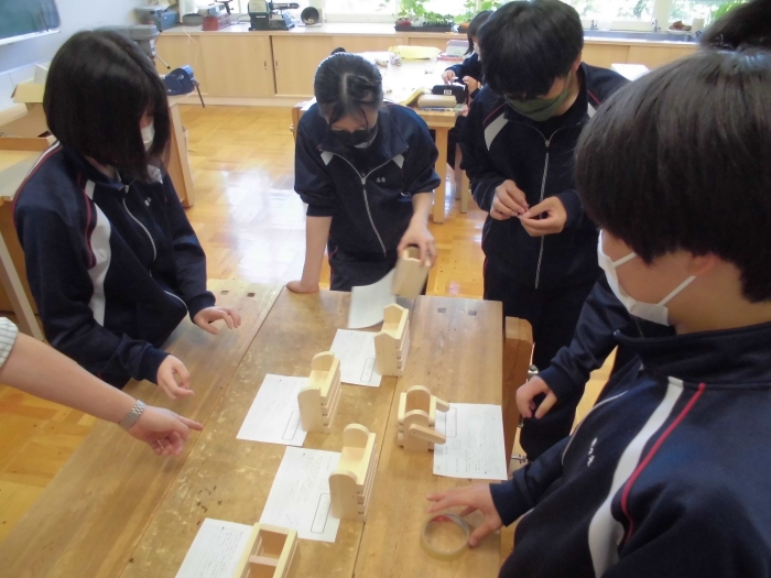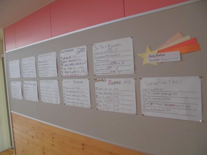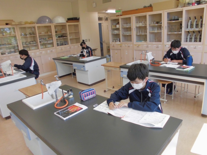 6月21日(火)の光景 2022年06月21日(火) 今日は朝から抜けるような青空が広がっています。 1枚目は2校時、3年生理科。テスト範囲のワーク問題にチャレンジしています。 2枚目は同じく2校時、2年生技術。小さな木製ラックを作成し、各自で採点しています。「ここがもう一つで…」とみんな辛口採点です。 3枚目は1年生教室の廊下掲示板。1年生英語の時間に作成した、一日のルーティンを英語で記したものが貼られていました。