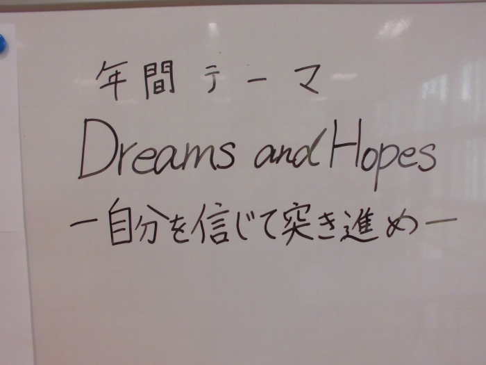 生徒による「年間テーマ」も決まったようで、ミーティング前に発表されました。今年の学校教育目標は、「自信をもって物事に挑戦し、最後までやり抜く力をもった生徒」です。