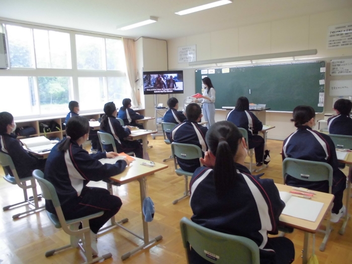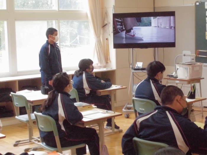 1年生は英語。日直が「今日は何月何日ですか?」「今日の天気は?」等英語で質問。他の生徒は英語で答えます。「洋楽を歌う」はChicagoのSaturday in the parkを歌っていました。