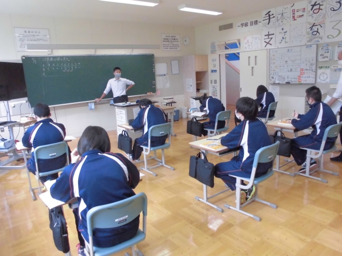 2年生は数学。1次関数です。y=ax+bの授業です。「数学は苦手!」という人の多くはこの辺りからとよく言われます。子供達の定着度・理解度をしっかり確認しながら進めてまいります。