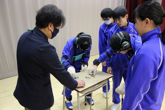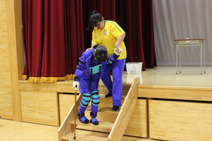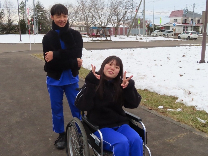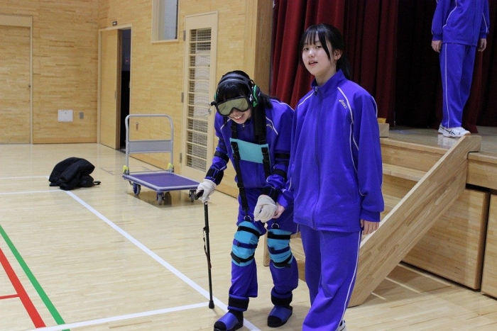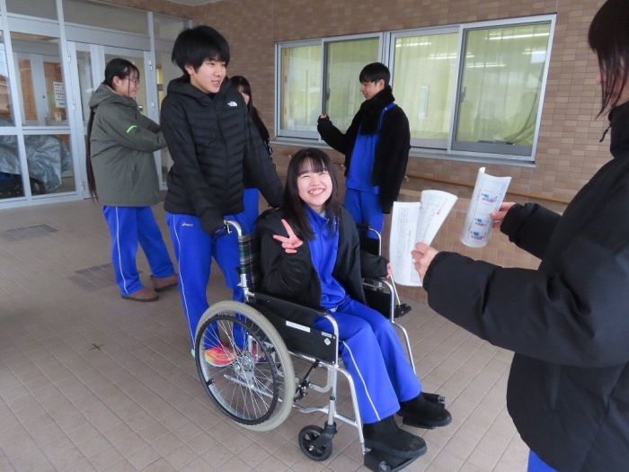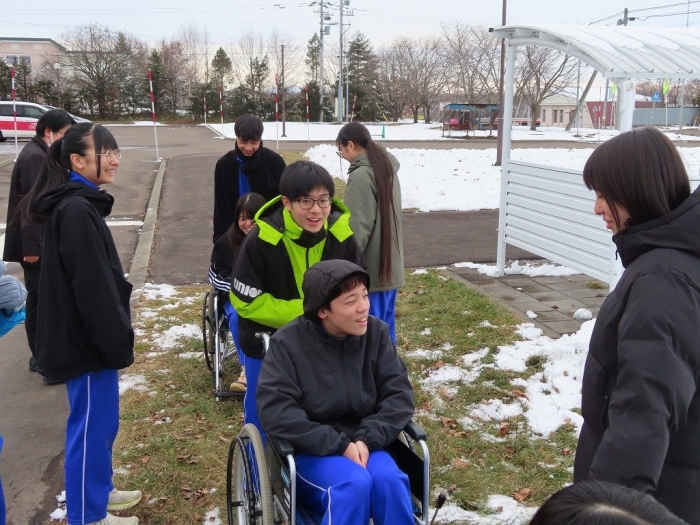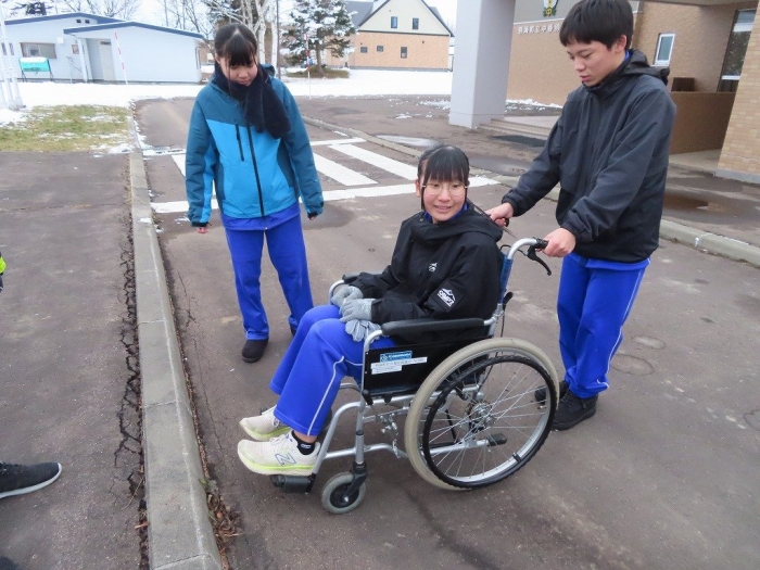 「高齢者疑似体験」では、専用の体験グッズを身にまとい、老化に伴う身体の変化や普段の生活にどのような影響が出るのかを体験しました。車椅子体験は、寒い中ではありましたが、玄関前のスロープや段差のある部分を使って移動してみたり、少し凸凹した芝生の上で押してみたりしました。動くことに制限がある人たち対して、どのように接したらよいのかを考える良い時間となりました。