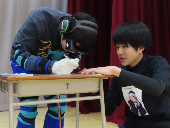 今日は、2・3年生を対象にした社会福祉協議会の福祉出前講座が行われました。今回の内容は、「高齢者疑似体験」「車椅子の使い方について」というものです。