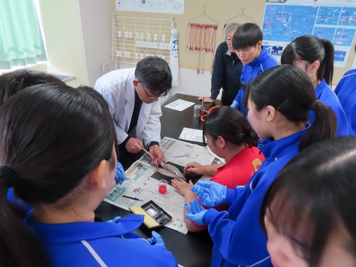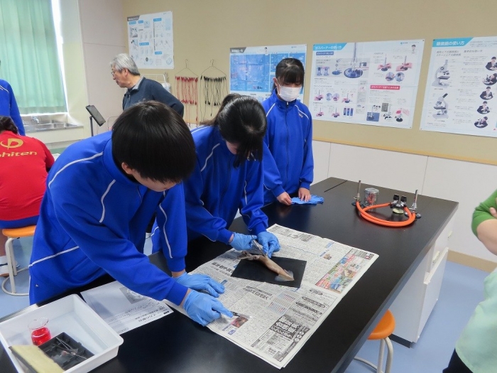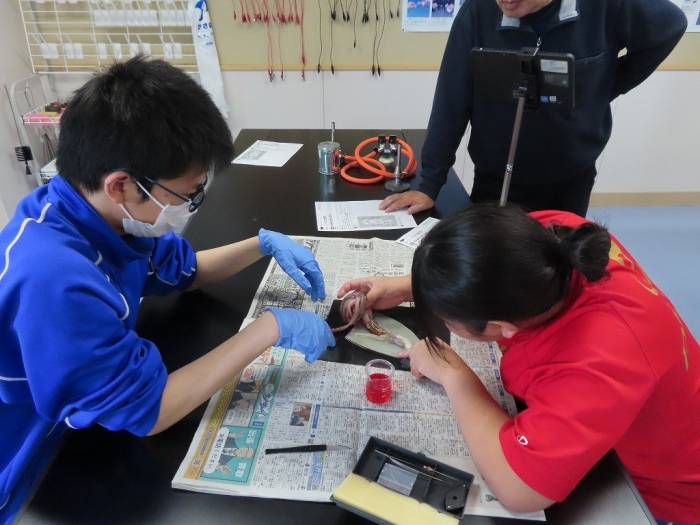 2年生は、先生に示された手順に従い、真剣な表情で作業を進めました。最初は恐る恐るイカに触れていましたが、徐々にハサミやメスを使って作業が進みました。きれいに外套膜をはがし、内臓の構造を観察しました。消化器系の流れを確かめるために、口から赤い色の水溶液を注いだり、目の水晶体を確認したりと、作業は順調に進みました。普段食べることのあるイカですが、命を感じながら生物に向き合う貴重な経験となったように感じました。