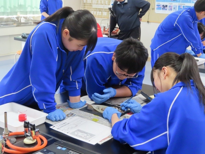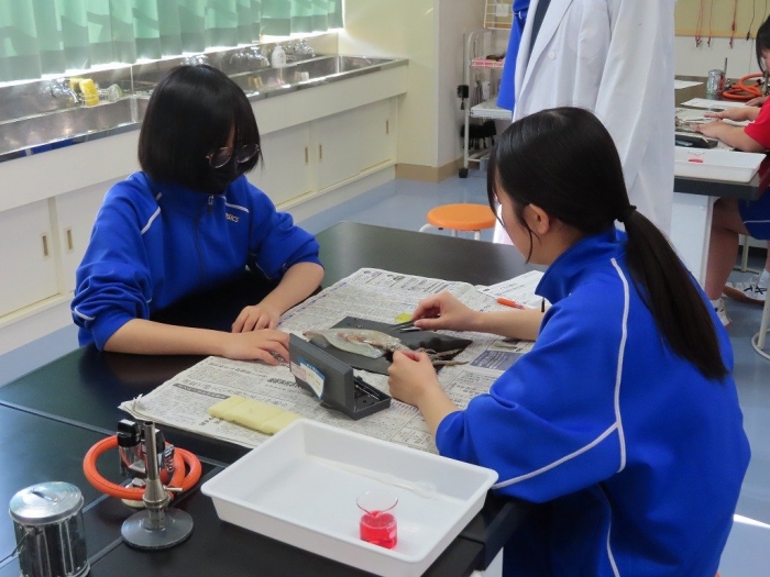 今日は2年生の理科の授業で「イカの解剖」を行いました。イカの身体と人間の身体について、共通点と相違点を調べることを目的として実施しました。