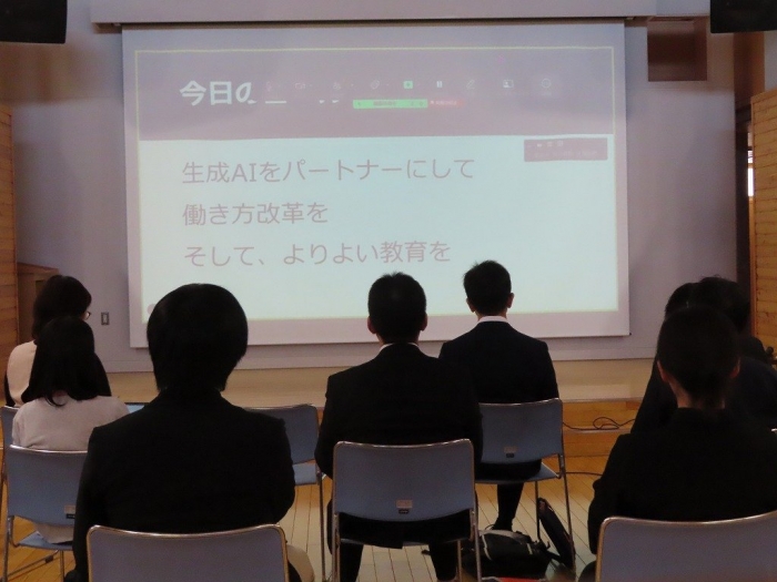 その後、職員研修も行われ、教師たちは生成AIツールであるChatGPTの活用方法について学びました。研修では、AIを使って生徒の学びをどうサポートできるか、また教師自身がAIを活用して授業をさらに充実させる方法について議論しました。さらに、AIを使って歌を作成する方法も紹介され、参加した教師たちはその創造的な可能性に驚き、学びの幅が広がることに対する期待感を深めました。AIの活用は教育現場に革新的な変化をもたらし、教師も生徒も共に新しい学びの形を模索していく過程において、大きな役割を果たすことが確信されました。