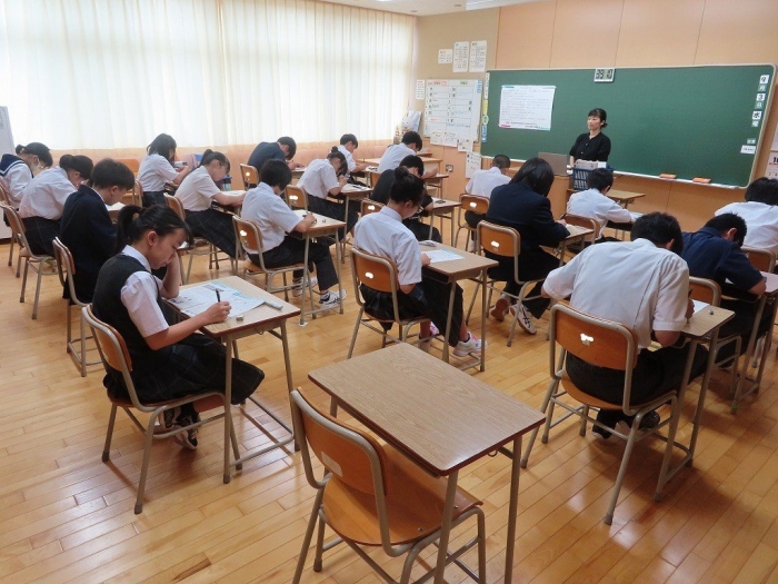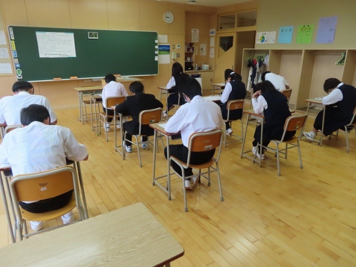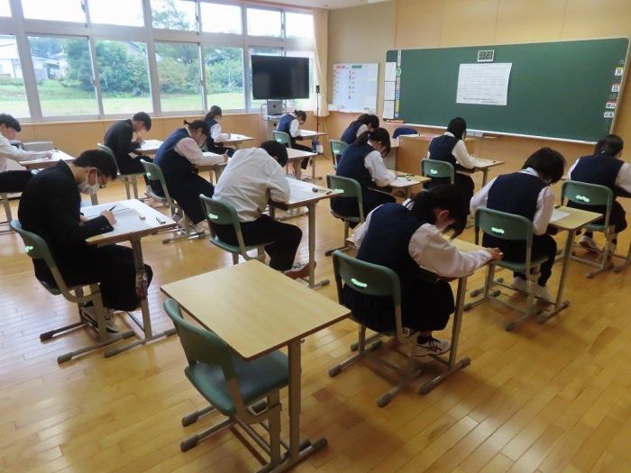 教室では、テスト開始の合図とともに筆記用具の音が響き渡り、緊張感のある空気が漂っていました。特に印象的だったのは、時間いっぱいまで粘って回答を続ける生徒たちの姿です。最後まで諦めず、問題に向き合う姿勢には、学びへの真剣さと成長の跡が見て取れました。