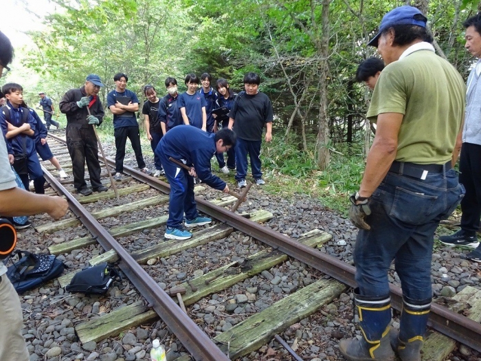 例年試乗していたトロッコについては、線路を支える枕木の補修作業のため、今年は試乗できませんでしたが、代わりにその枕木の補修作業を体験させていただきました。