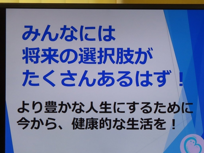 また、将来の選択肢がたくさんある3年生に向けて、より豊かな人生を送るためにも、今のうちから健康的な生活を心がけることの大切さについても教えていただきました。