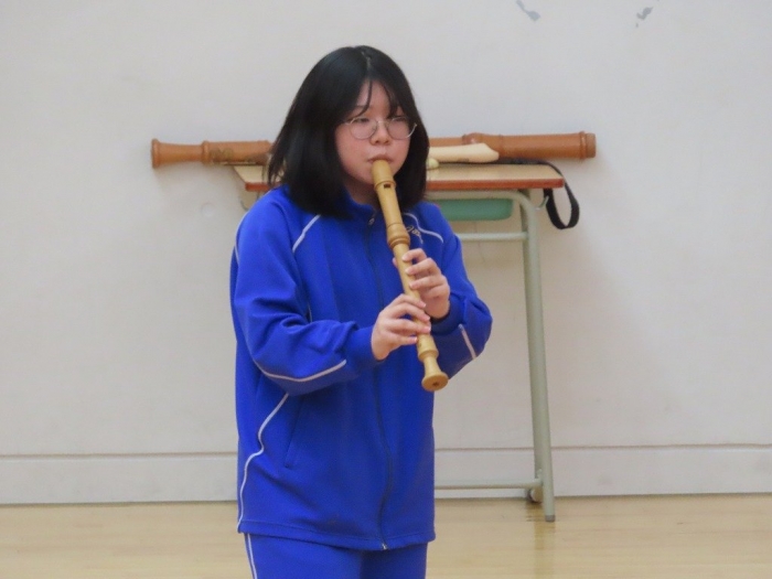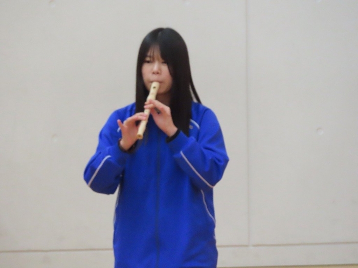 今日は、1年生2名による初めてのコンサートでした。最初は少し緊張した様子でしたが、「アルマンド」と「メヌエット」を連続で演奏し始めると、その緊張もほぐれ、次第に普段の表情で楽しんで演奏している様子が見受けられました。その後、文化祭で4名で演奏した「ホール・ニュー・ワールド」を2重奏で披露し、さらに顧問の先生方を加えた4名で「花は咲く」を演奏しました。