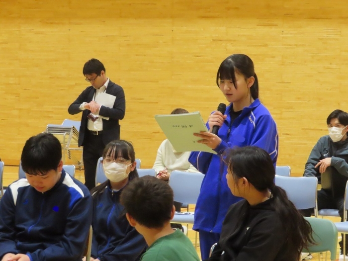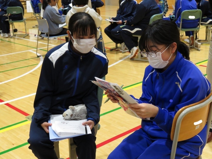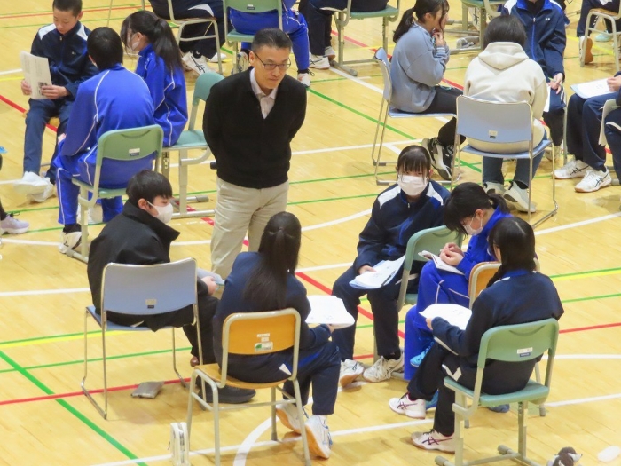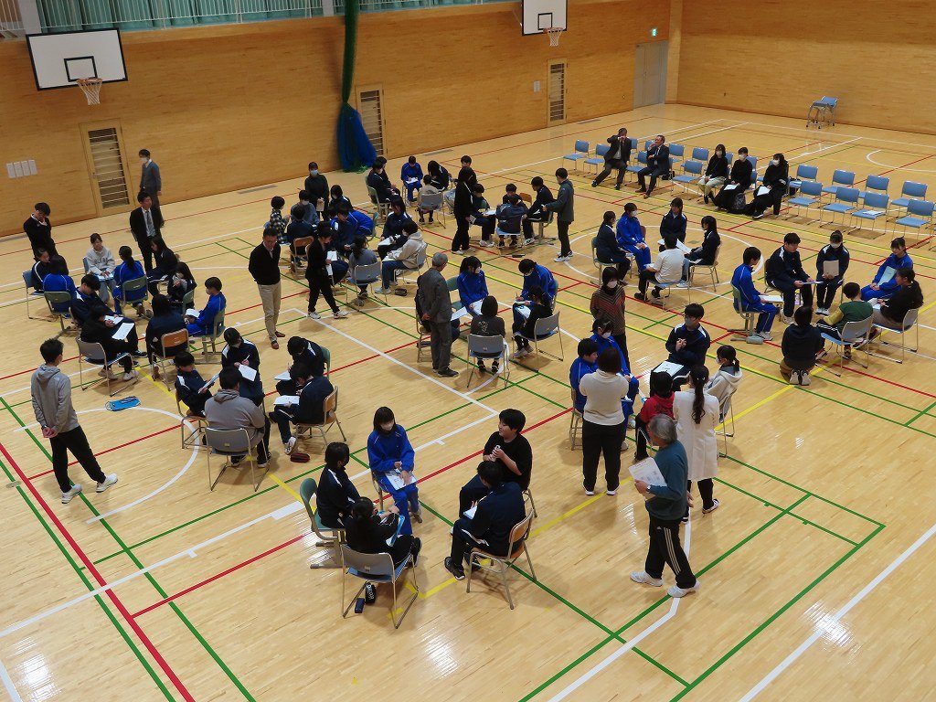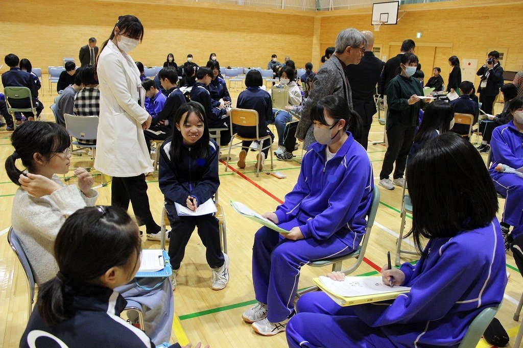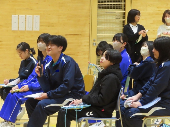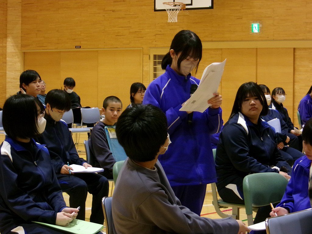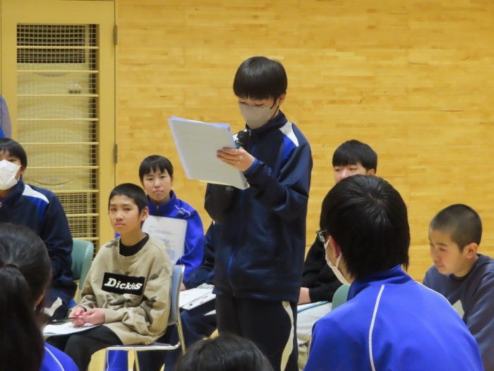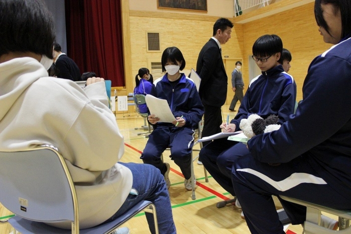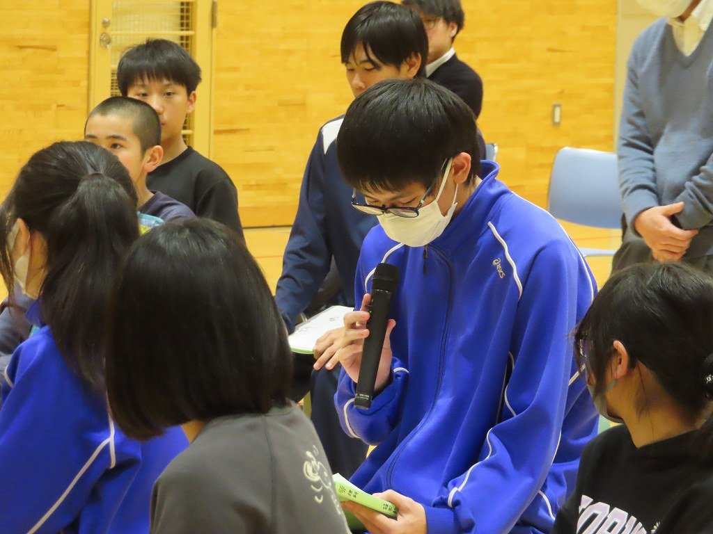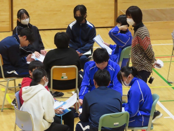 小学生と中学生が同じテーマについて一緒に考えるのは初めての取組だったため、はじめは中学生が少し緊張した表情を見せていましたが、話し合いが進むにつれて徐々に中学生が中心となって意見をまとめたり、小学生の考えを引き出したりする姿が見られました。友だちの意見を聞きながら、それぞれが自分の考えを整理する時間となりました。