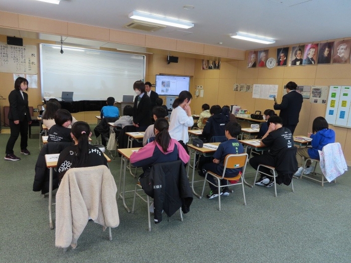 次に授業見学を行いました。1年生の美術、2年生の英語、3年生の国語の授業を見学した6年生の様子から、中学校入学を楽しみにしている様子が伺えました。体験授業では、積極的に発言する姿が見られるなど、社会の学習に楽しみながら取り組んでいました。