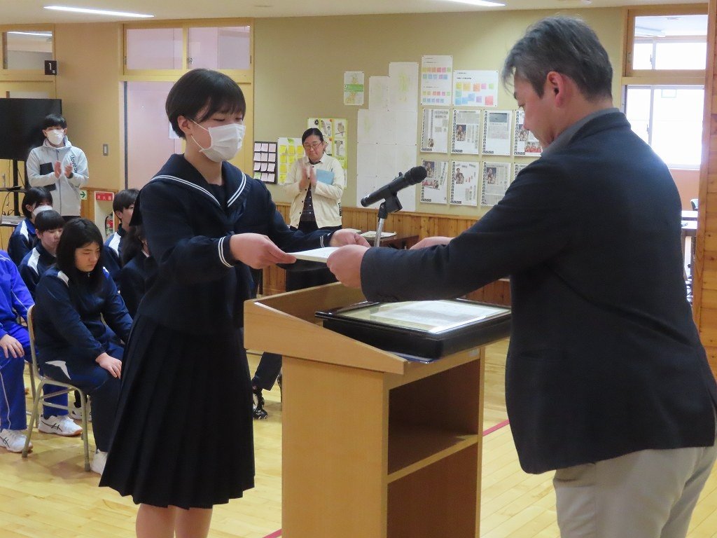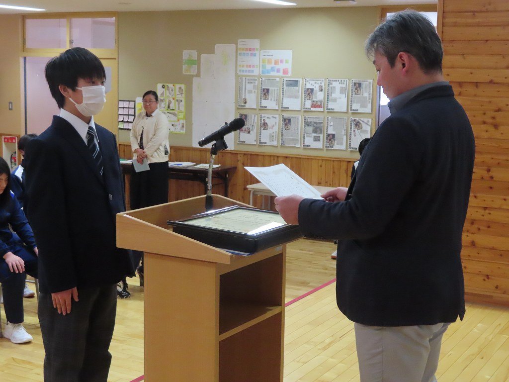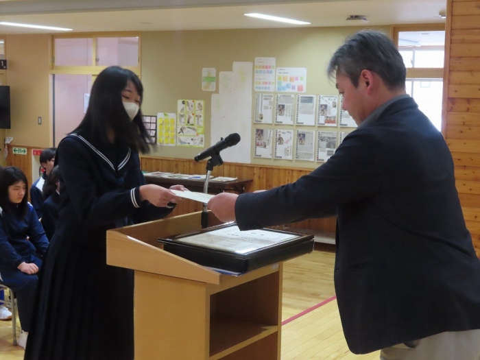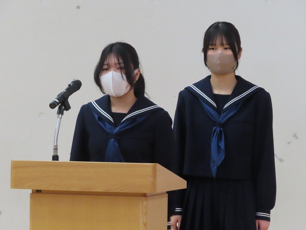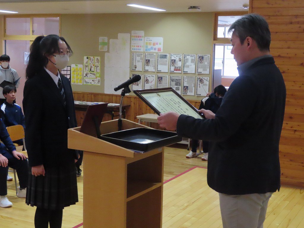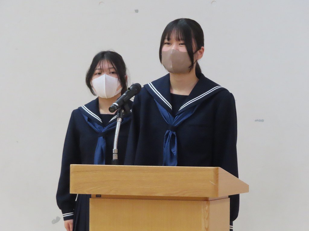 最後に校長先生からは、「二人が述べた思いや願いが実を結ぶことを願っています」「全国での経験を今後のステップアップにつなげてほしい」とのお話があり、互いの努力を称え合う有意義な集会となりました。