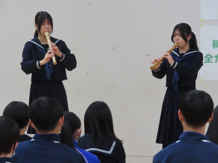 その後、美しいリコーダーの演奏が披露され、会場は温かな拍手に包まれました。生徒代表からは、「本番でベストを尽くせるよう体調管理にも気を配り、自信をもって全力で演奏してきてください」と激励の言葉が送られました。