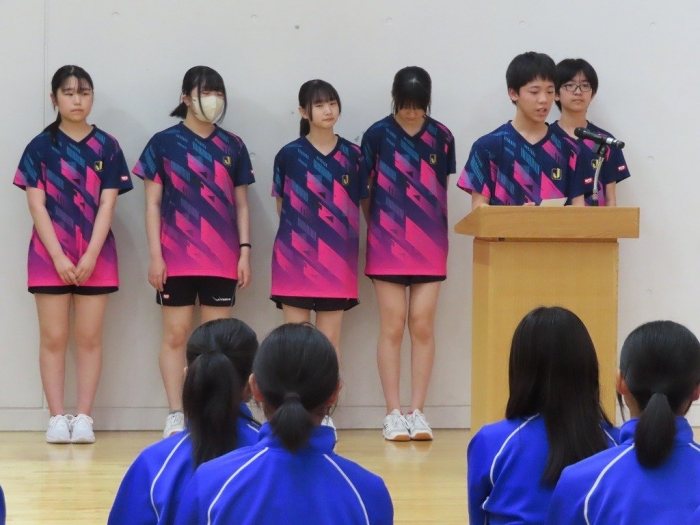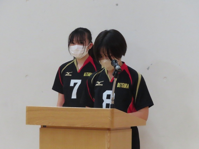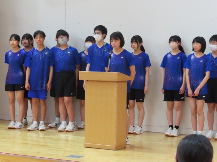 校長先生からは、日本ハムファイターズの新庄剛志監督の好きな言葉「努力は一生、本番は一回、チャンスは一瞬」を引用し、「中体連にやり直しはないため、大会を楽しみながらも日々努力してきたことを存分に発揮してください。勝っているときは気を緩めないこと、負けているときには諦めないこと、そこにチャンスが訪れます」と激励の言葉がありました。生徒を代表してFさんからは、「どの部も一生懸命に練習してきたことは分かっているので、その成果を発揮できるよう生徒・先生方全員が応援しています」と力強い言葉がかけられました。皆さんの熱い熱い戦いが見られることを期待しています。