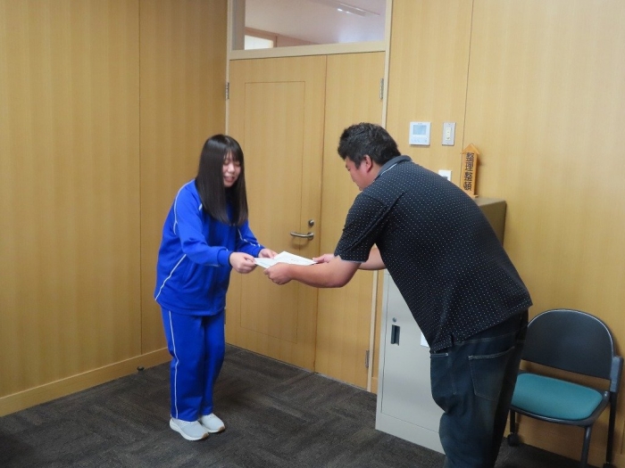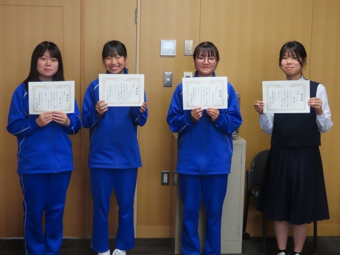 ロールパックメッセージの表彰 2024年07月24日(水) 例年、本校では、6月頃にJA中春別様の呼びかけのもと、ロールパックメッセージの標語づくりに取り組んでいます。その表彰が今日行われました。 優秀賞に3年生SIさんと1年生Kさん、努力賞に3年生AさんとFさんが選ばれました。4人には賞状のほかに図書カードも贈呈されました。また、全校生徒に参加賞も配られました。JA中春別様、ありがとうございました。