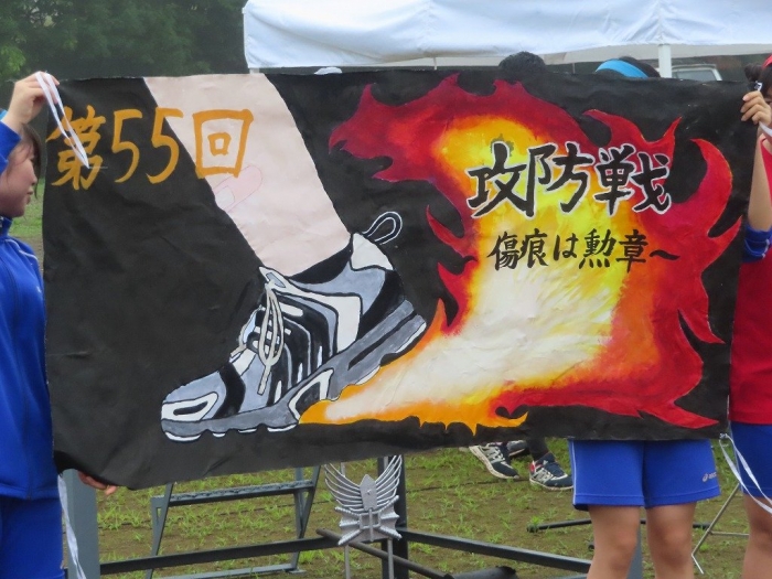 心配された天候も持ち直し、運動に適した気温の中で第55回体育祭が開催されました。『攻防戦~傷痕は勲章~』というテーマのもと、赤組、青組それぞれが準備・練習をしてきました。