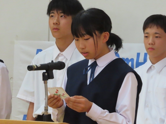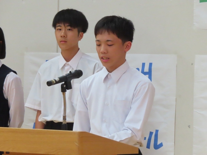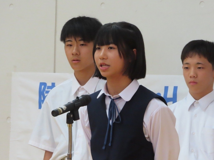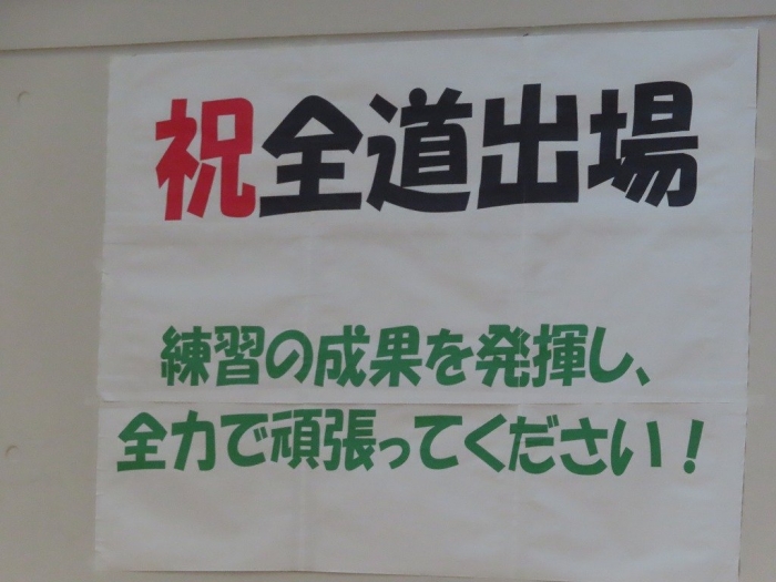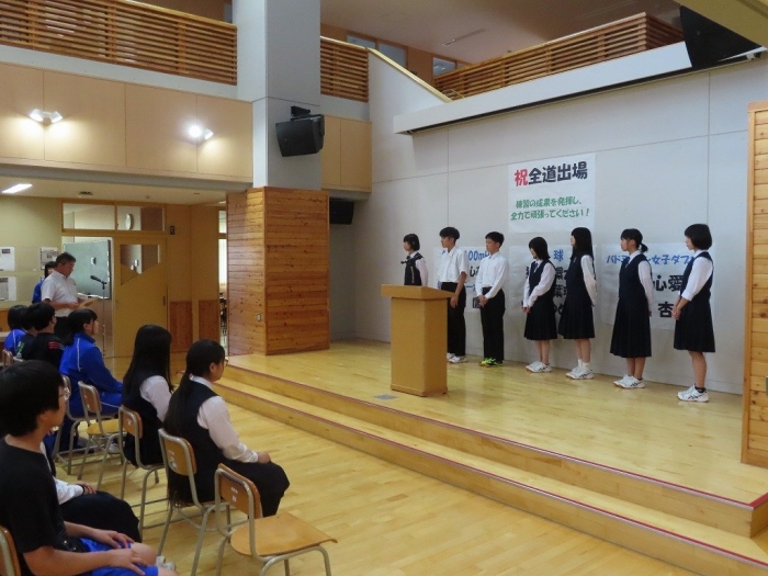 放課後には、全道壮行式が行われました。本校からは、4競技7名が出場します。校長先生からは、「試合に向けてコンディションづくりの大切さ」や「自分との闘い」「相手との闘い」についてをメインに激励の言葉をいただきました。その後、それぞれの競技の代表が決意を述べました。また、生徒代表からも「全校で応援しています」という力強い激励の言葉がありました。