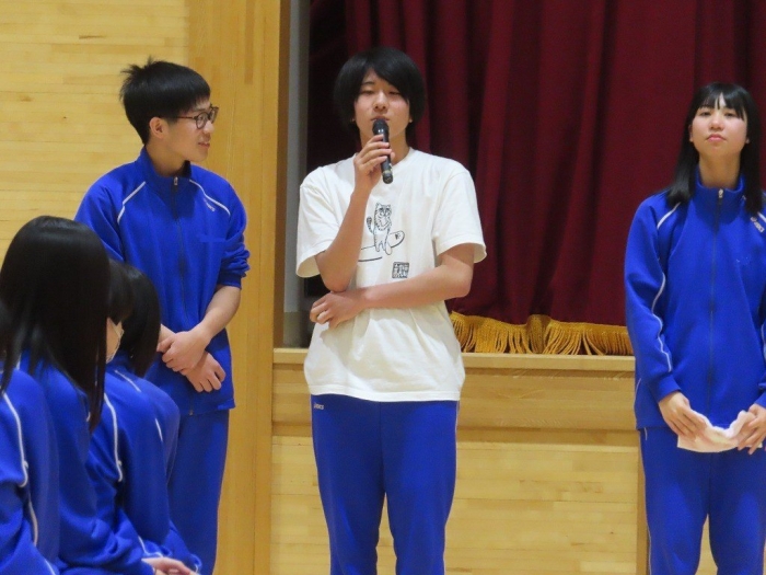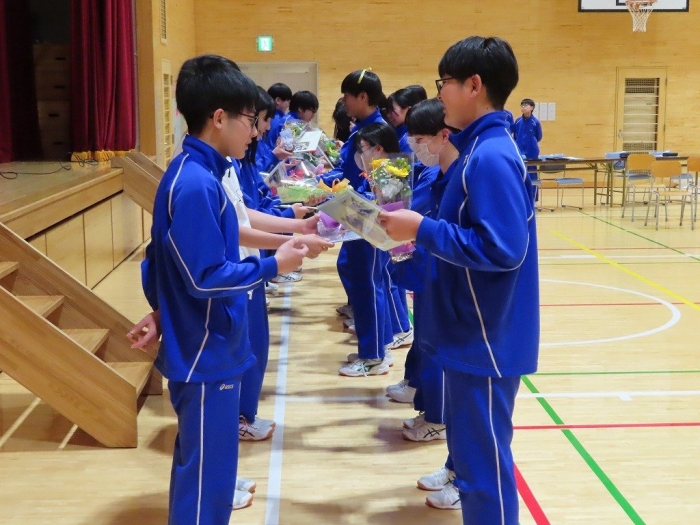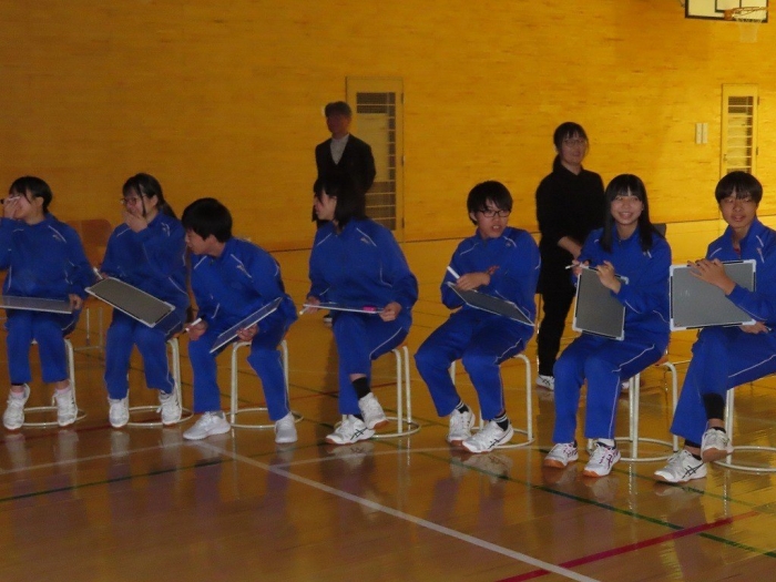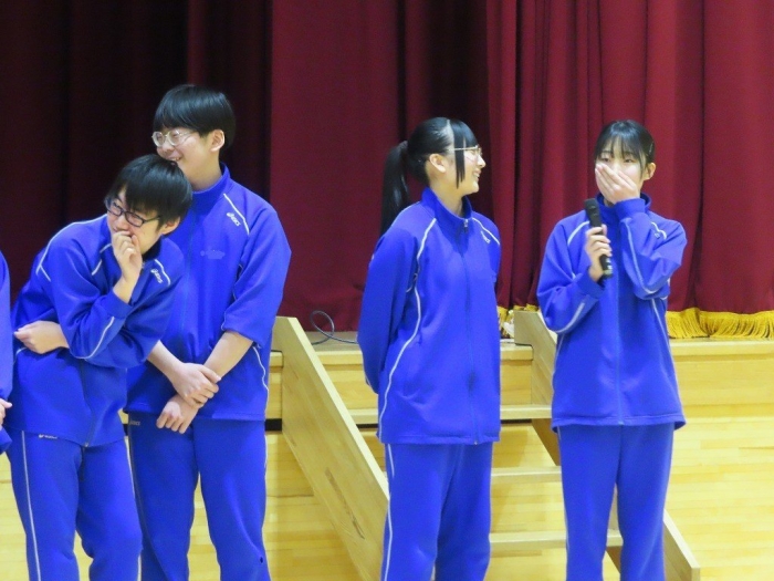 今日の3・4時間目に3送会が開催され、在校生たちは卒業生を楽しませるために、クイズやダンスを披露しました。特に、在校生の準備した心温まる演出が印象的で、会場は笑顔と拍手に包まれました。さらに、元担任の平野先生からのビデオメッセージもありました。平野先生は「離れていても皆のことは頭の片隅にある」と語り、卒業生一人一人に向けた温かいメッセージが心に響きました。その言葉に、会場全体が感動し、涙を浮かべる卒業生もいました。