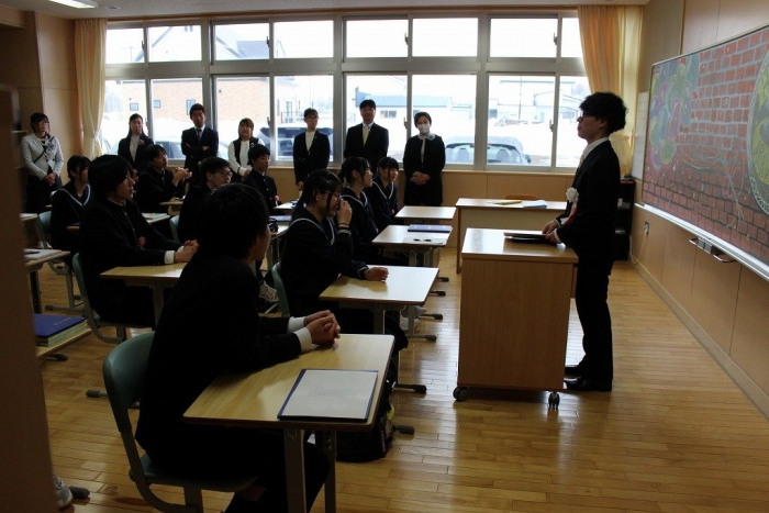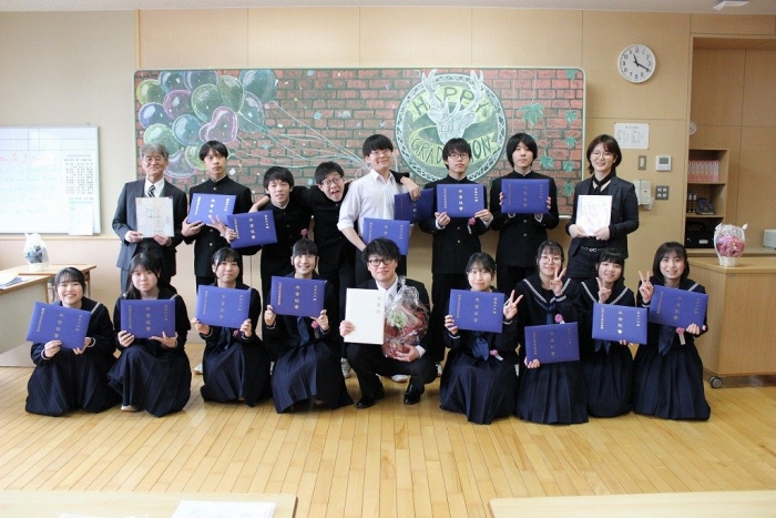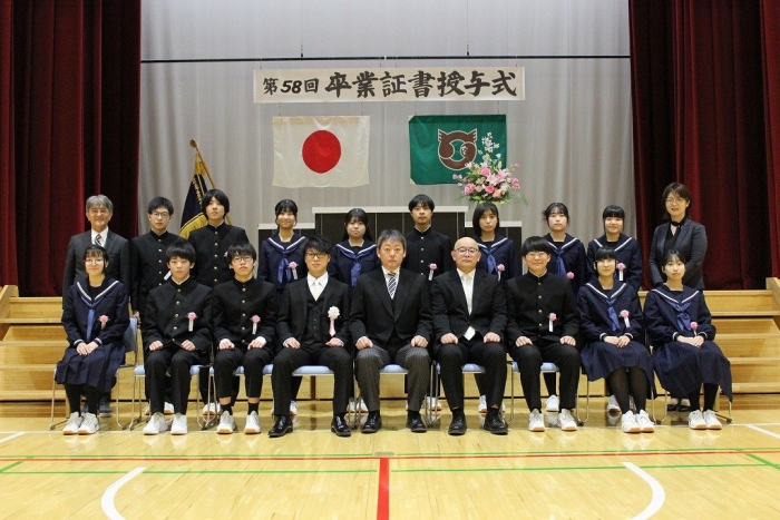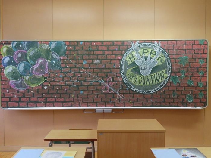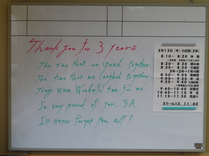 今日は卒業式でした。朝、3年生の教室には在校生が描いた黒板アートと、担任の鹿又先生からのメッセージがあり、3年生の最後の登校日であることを再確認しました。式の開始前には、体育館で卒業写真を撮りました。