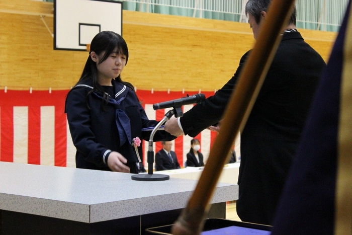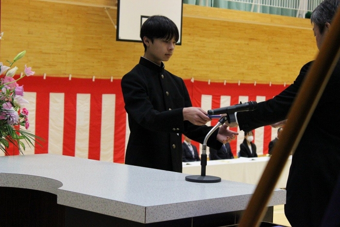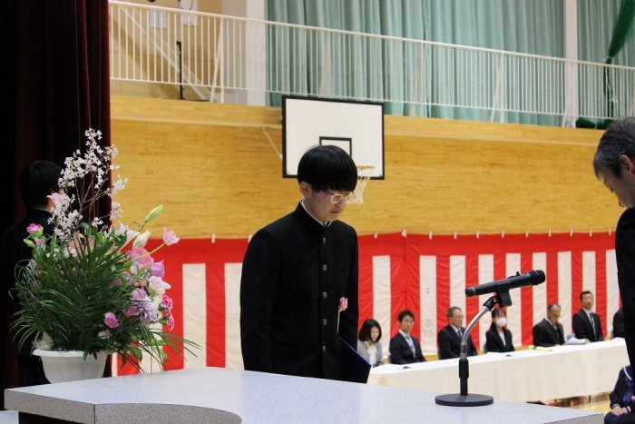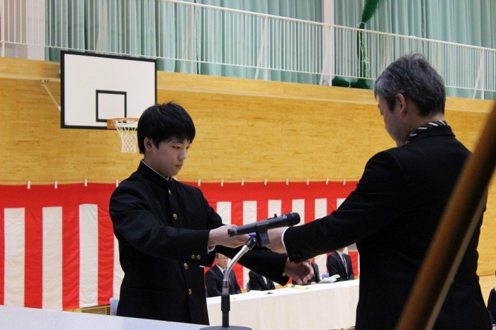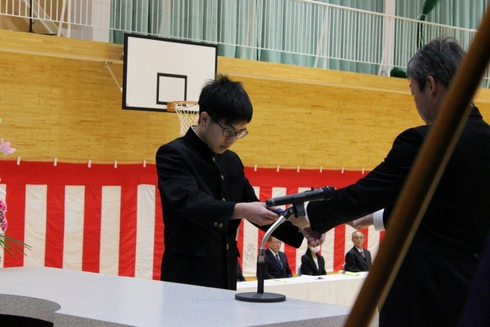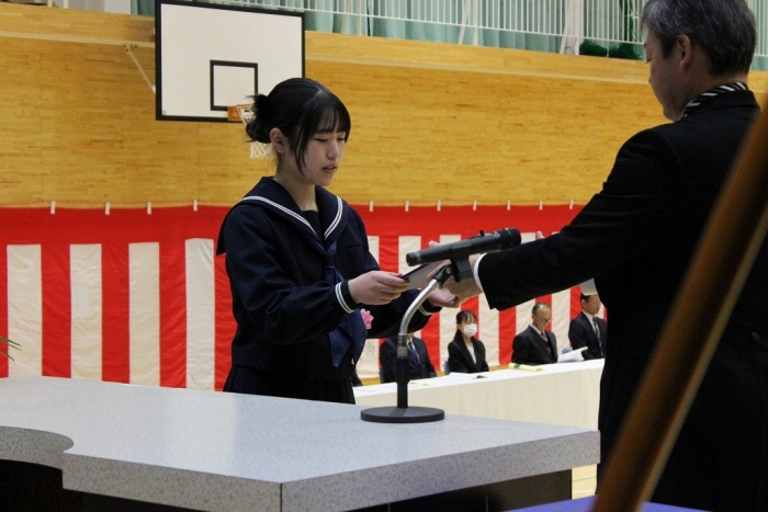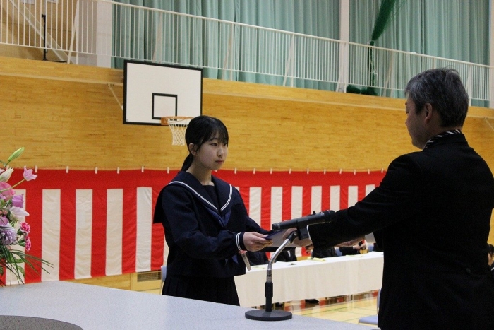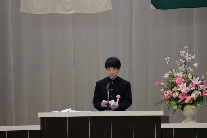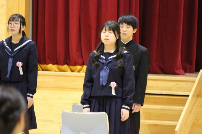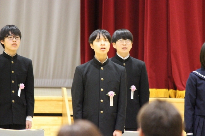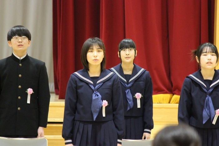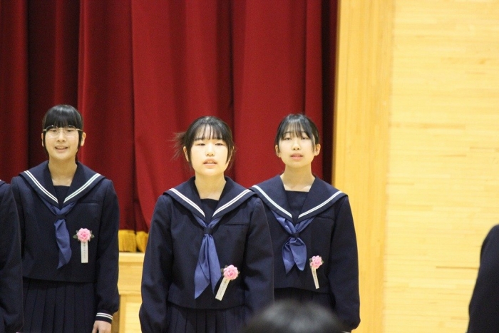 9時40分より卒業式が挙行され、全校生徒が式に臨む姿勢は非常に立派で、感動的でした。卒業生全員が証書授与の際、大きな声で返事をし、その姿からはこれまでの努力と成長が感じられました。また、合唱のパフォーマンスも素晴らしく、「支えてくれた人たちへの感謝の気持ち」を伝えるべく、全員が心を一つにして歌う姿は、在校生にとって模範となる感動的な瞬間でした。