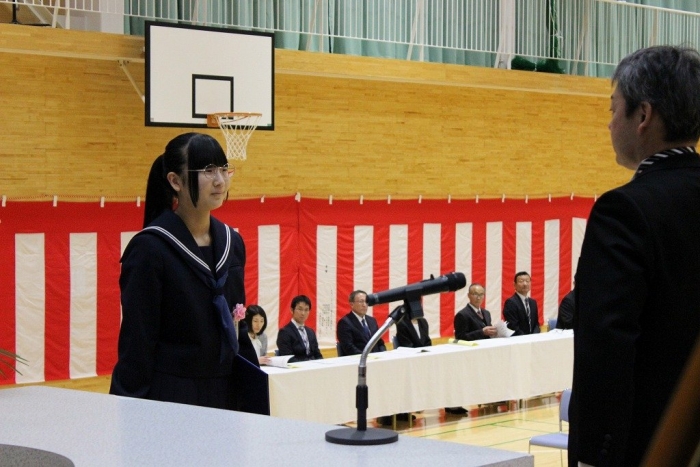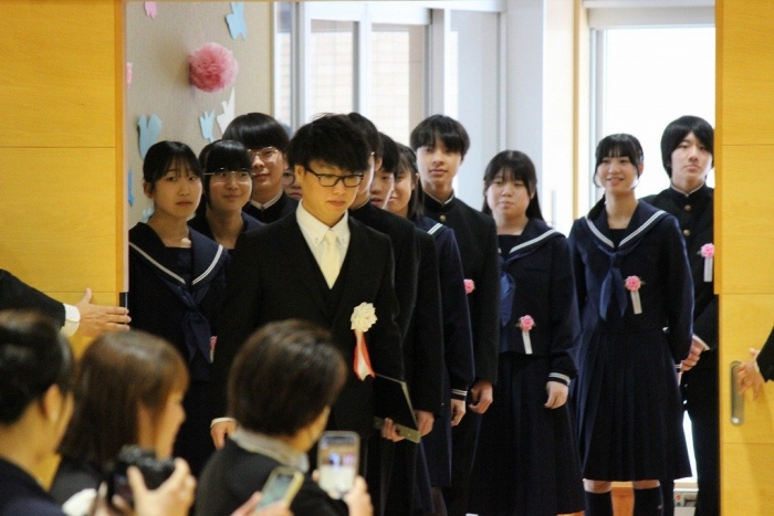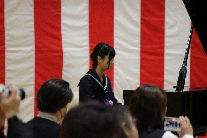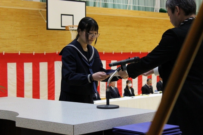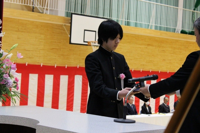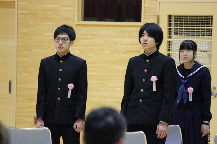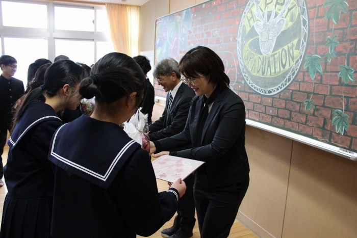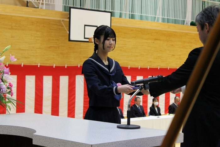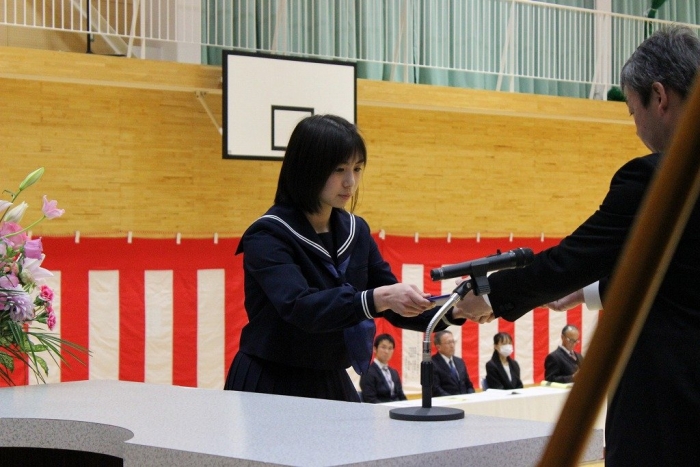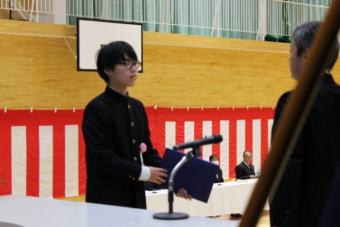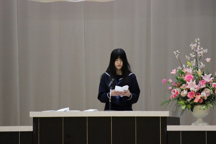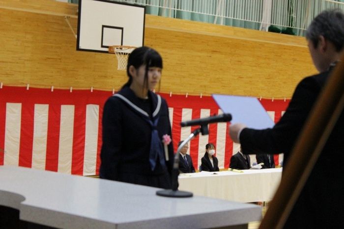 9時40分より卒業式が挙行され、全校生徒が式に臨む姿勢は非常に立派で、感動的でした。卒業生全員が証書授与の際、大きな声で返事をし、その姿からはこれまでの努力と成長が感じられました。また、合唱のパフォーマンスも素晴らしく、「支えてくれた人たちへの感謝の気持ち」を伝えるべく、全員が心を一つにして歌う姿は、在校生にとって模範となる感動的な瞬間でした。