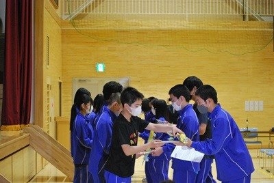 【中春別中学校】3年生を送る会 3年生からのあいさつ 2022年03月09日(水) 行事 3年生を送る会、第3弾です。1、2年生の出し物が終わった後、3年生に色紙と花が贈られました。その後は3年生から1、2年生に向けてのあいさつです。3年生からの気持ちのこもったメッセージを真剣に聞いていました。