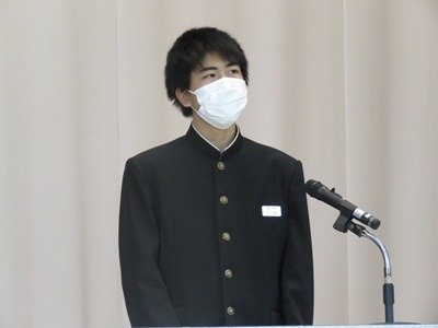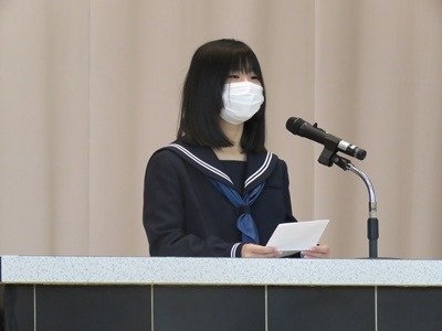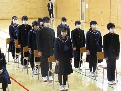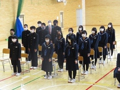 2年生18名、1年生10名に修了証書が授与されました。1年生代表のTさんは「もっと勉強を頑張れたと思う。」「クラス目標が達成できた。」と1年間を振り返っての感想を発表しました。2年生のOさんは「自ら意見を出して、自分たちで考えて行動できるようになった。」「3年生になったら今まで以上に責任を持って行動したい。」と、次年度に向けての決意を発表しました。