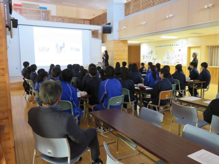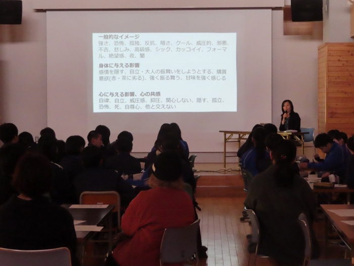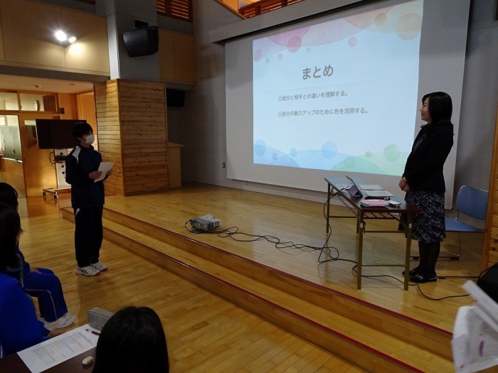 今日の5・6時間目に、PTA研修講座が行われました。講師に時野晴美氏をお招きし、全校生徒がパーソナルカラー診断を体験しました。