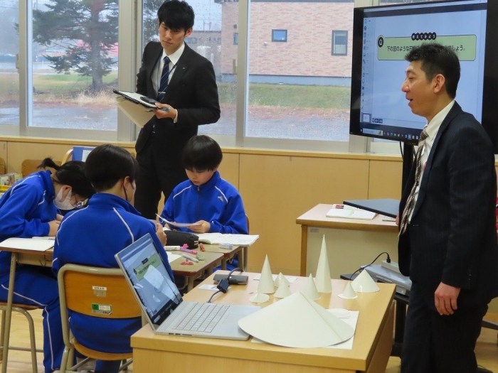 数学の授業内容は『空間図形』です。今回は、円錐の底面と側面の関係について、実際に円錐を作りながら生徒たちがその関係について考えを深めました。積極的に協働しながら楽しそうに意見を交流する姿が見られました。